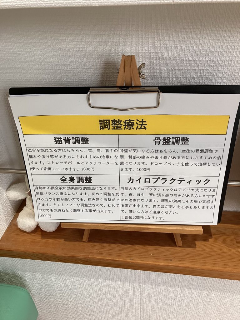 2026年1月20日 / 最終更新日 : 2026年1月20日 tomotomo お知らせ 調整料金について 当院の調整は 猫背調整、骨盤調整、全身調整、カイロプラクティックと4つ用意しております。 ゆるい調整から少し強めの調整等、幅広く揃えておりますので、気になる方は是非来院下さい Follow me! FacebooktwitterHatenaPocketCopy